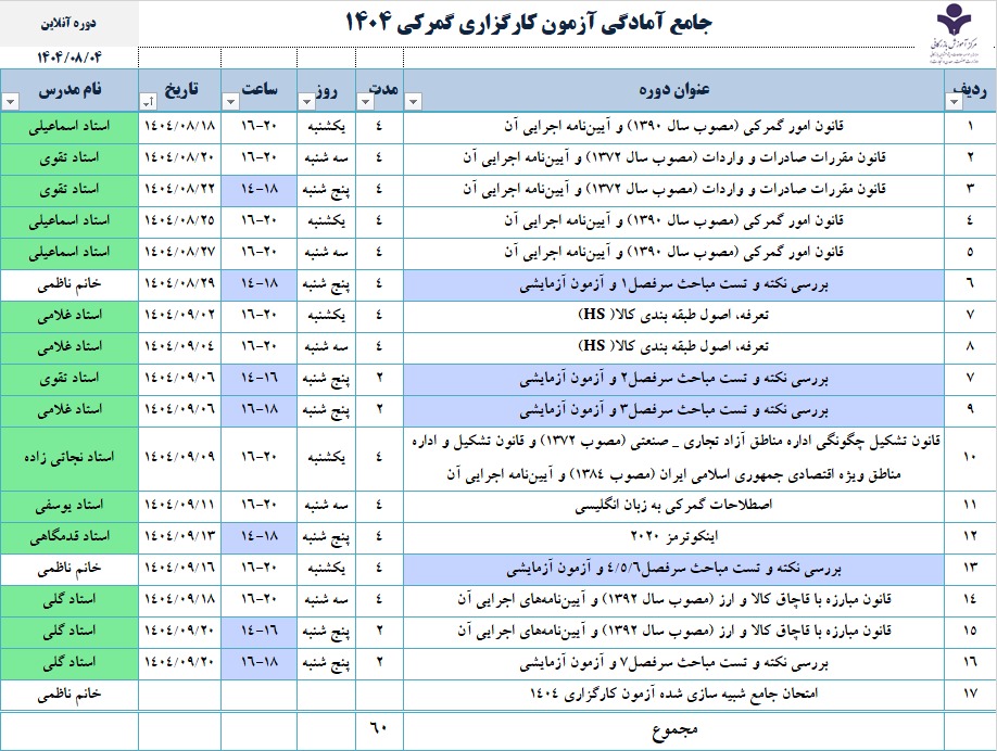 دوره جامع آمادگی آزمون کارگزاری گمرک هر ساله در مرکز آموزش بازرگانی با تدریس مجربترین اساتید و نخبگان گمرکی کشور برگزار می شود.