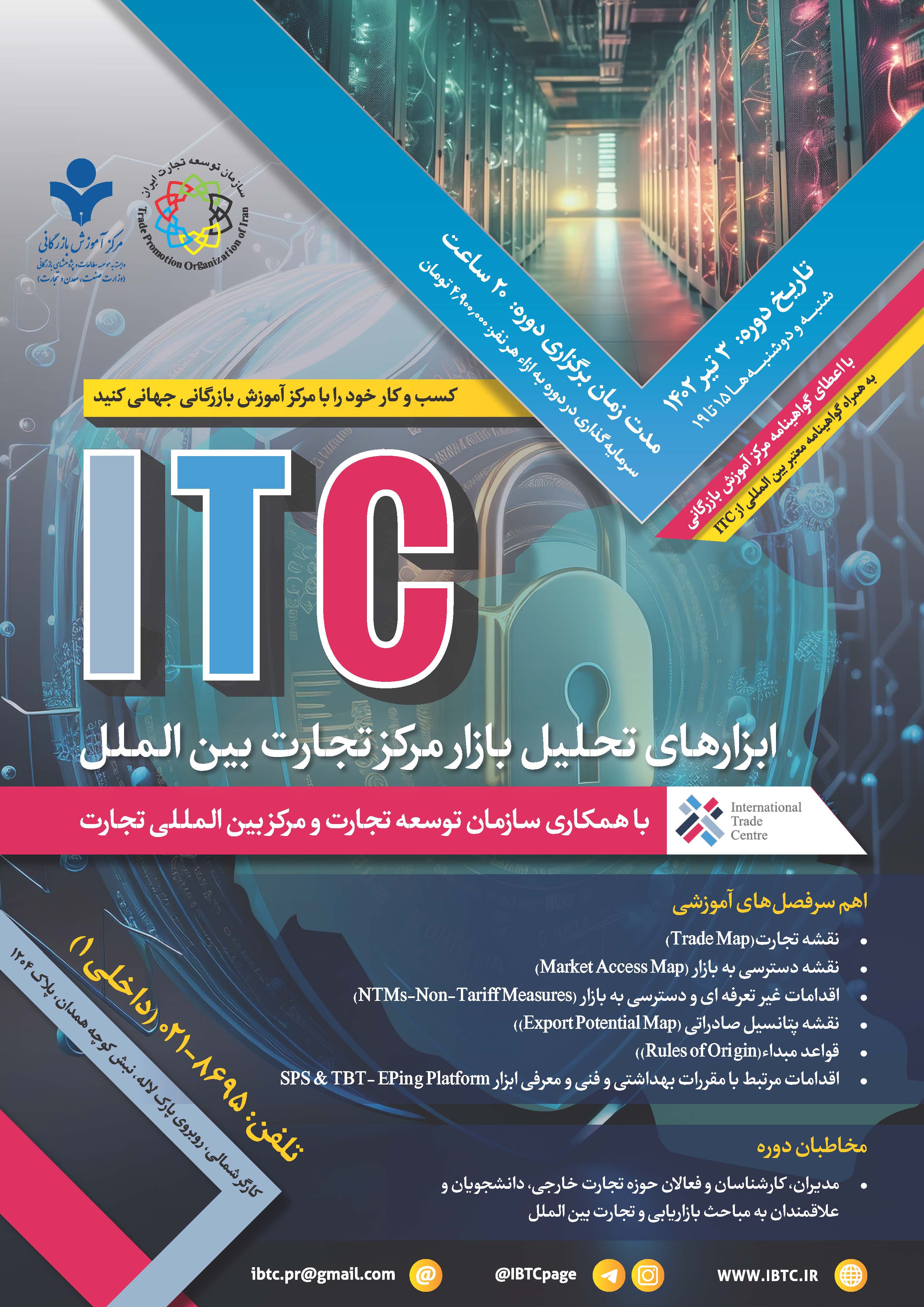 مرکز آموزش بازرگانی در نظر دارد در راستای افزایش دانش و مهارت تخصصی و کاربردی بنگاه های اقتصادی در زمینه تجارت بین الملل و کسب اطلاعات تجاری از بازارهای هدف صادراتی ج.ا. ایران، با همکاری سازمان توسعه تجارت و مرکز بین المللی تجارت ( International Trade Center- ITC ) دوره آموزشی ابزارهای تحلیل بازار مرکز تجارت بین الملل- « Market Analysis Tools را توسط مدرسان مورد تاییدITC » و با ارائه گواهینامه بین المللی معتبر از سوی مرکز مذکور برگزار نماید.